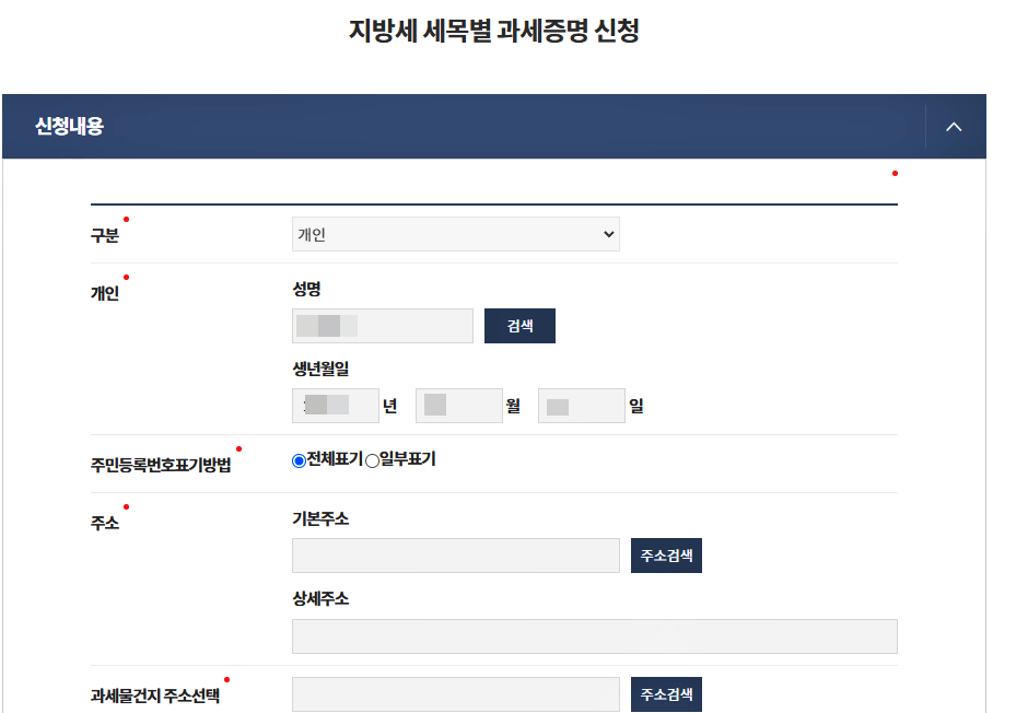 신청내용에 이름과 생년월일, 주소를 입력한 다음 사용 목적은 확인용 또는 자동차 매매 등 본인의 발급 목적에 맞게 작성해 주시고 과세목록 조회를 클릭해주세요