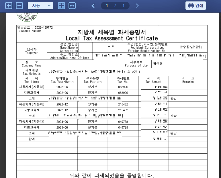 인쇄 될때 자동차세 완납증명서 간편하게 프린트 하는  예시 입니다.