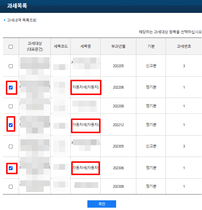 자동차세에 해당 되는 목록들을 모두 체크해 주세요