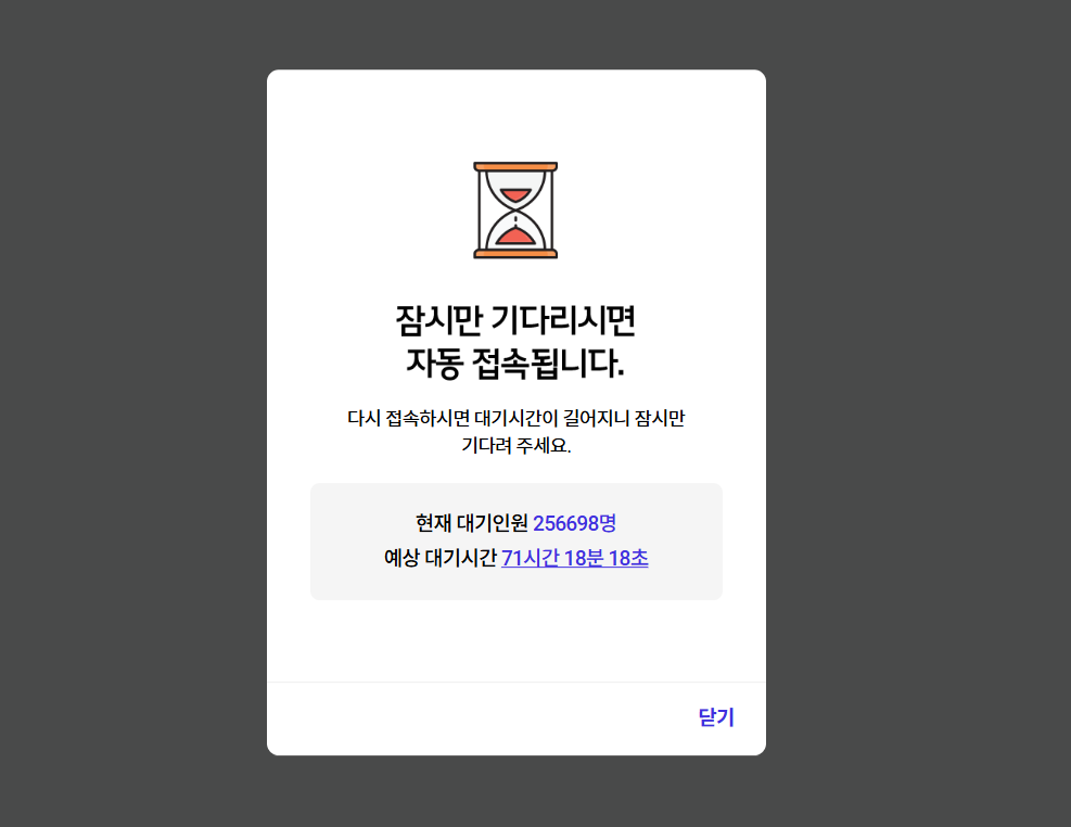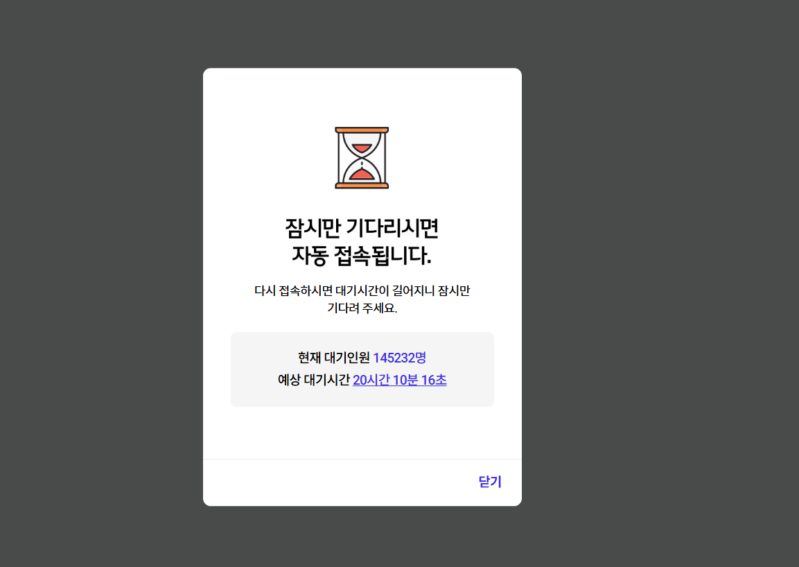 처음 접속 했을 때는 4만 명 접속을 하였으나 지금은 대기인원 145천 명 대기로 예상 대기도 지연되고 있습니다.