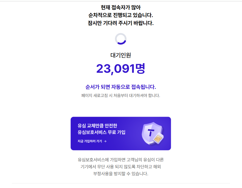 현재 많은 접수자수가 몰려서 계속해보는 수밖에 없을 것 같습니다. 많이 몰리지 않는 시간에 다시 시도를 해봐야 될 것 같습니다. 링크는 해당 화면에 유심 교체예약 시스템과 유심보호서비스 사전예약과 유심보호서비스 오늘 중으로 마무리하시길 바랍니다.
